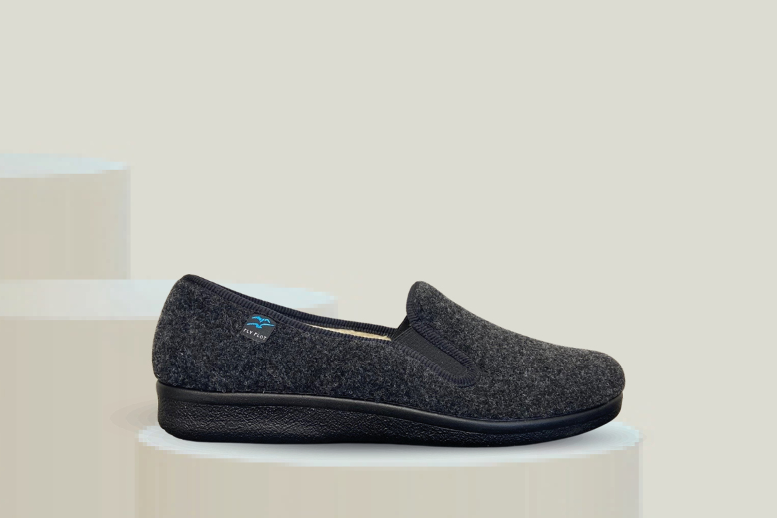 Tøffel til herre med ullför. Anatomisk formet såle med behagelig demping. Modellen er medium fit og meget lett. Med strikk i sidene gjør dette at tøffelen utvider seg idet man tar den på. Fly Flot er fottøy av høy kvalitet laget i Italia.
