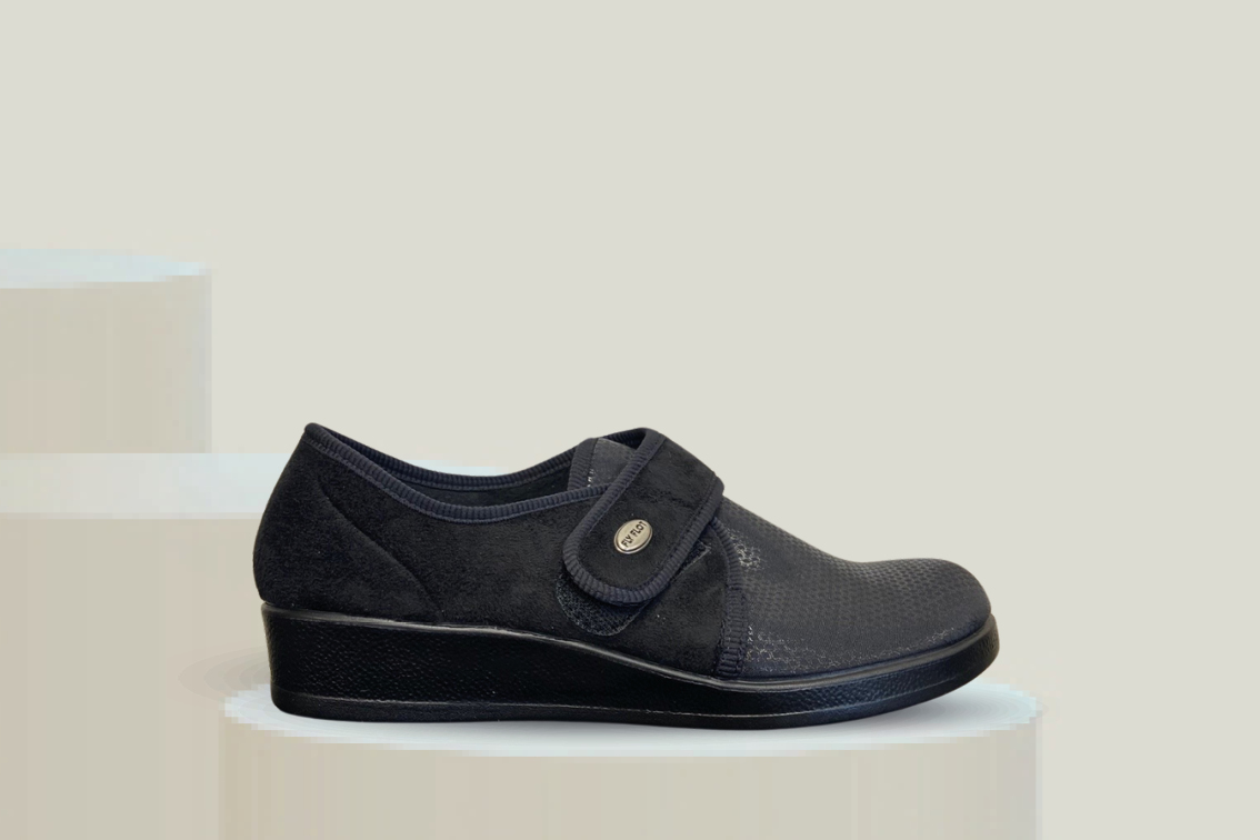 Sko/tøffel i et tøyelig stretch materiale. Over vrist er det en borrelås så den kan tilpasses etter foten. Anatomisk formet såle med behagelig demping. Modellen er ekstra bred og meget lett. Stretchmateriale passer godt til en fot som er ekstra følsom. Fly Flot er fottøy av høy kvalitet laget i Italia.