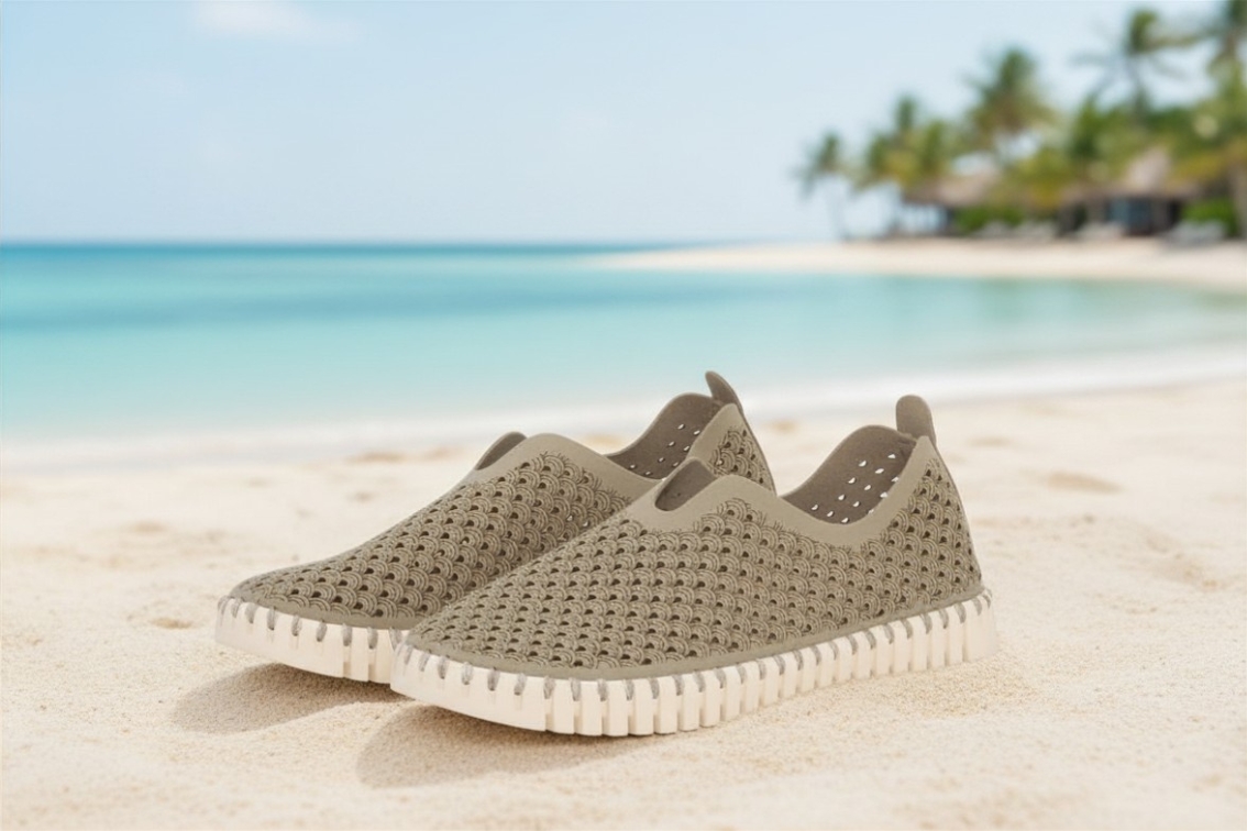 Lett og feminin slip-in sko med fleksibel såle og elegant perforert design. Perfekt til sommerkjoler, jeans, fritid og komfortable hverdagsantrekk.
