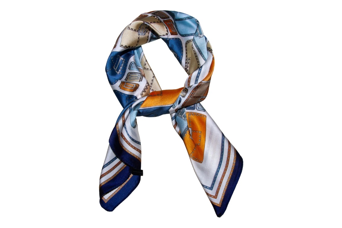Dekorativt skjerf med veskeprint i blåtoner. Et stilfullt og lekent tilbehør som gir antrekket et unikt og moderne uttrykk.