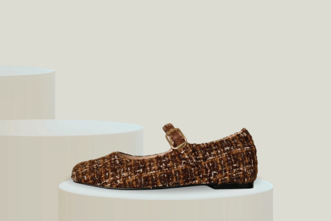 Philip Hog Mary er en stilren og sofistikert ballerina, inspirert av klassiske silhuetter med en moderne vri. I brun tweed får modellen et varmt og elegant uttrykk som passer perfekt til både hverdagsantrekk og mer pyntede anledninger.