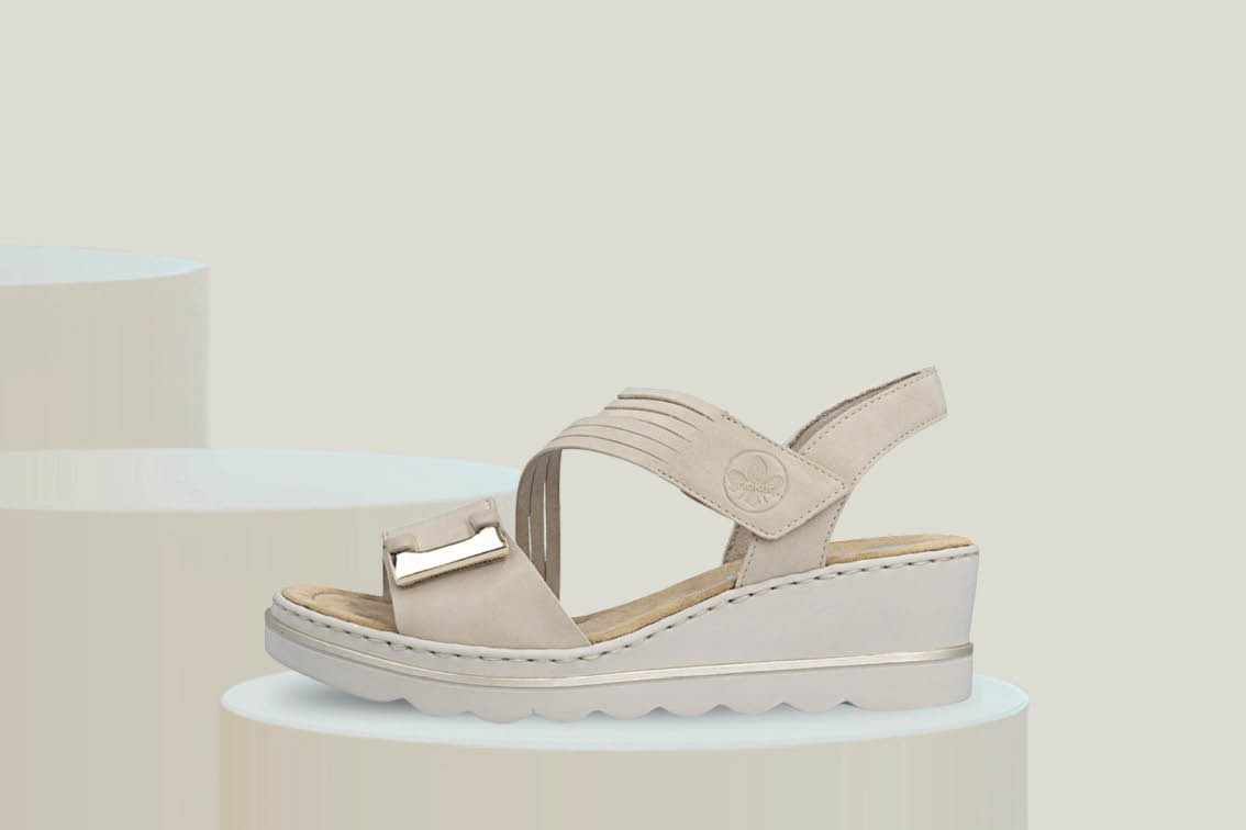Komfortabel og elegant damesandal fra Rieker med kilehæl, myk såle og praktisk borrelåslukking. Perfekt til sommerens hverdager og ferier.