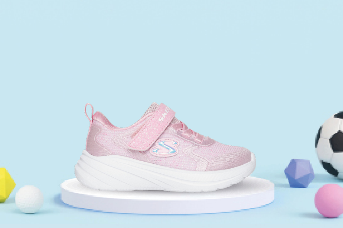 Lett og komfortabel joggesko til små barn fra Skechers med glitrende overdel og enkel borrelåslukking.