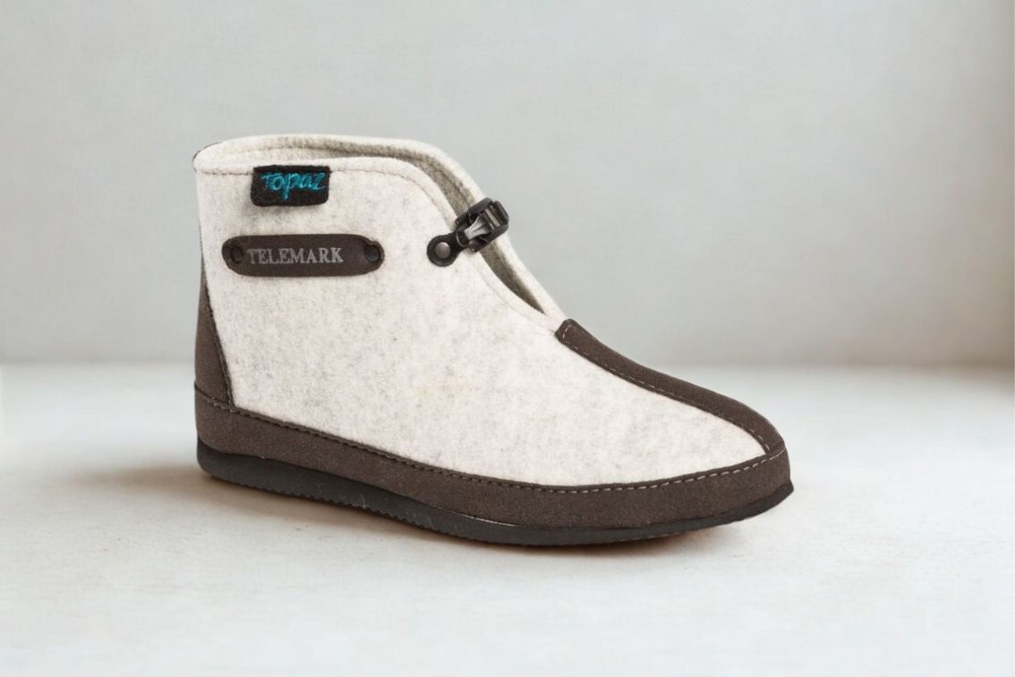 Topaz Rufus er en klassisk og komfortabel tøffel med inspirasjon fra norsk tradisjon og design. Laget i kraftig ullfilt (70 % ull), gir den naturlig varme og puster godt slik at føttene holder seg tørre og behagelige. Den myke og fleksible passformen gjør Rufus til en favoritt for både dame og herre. Tøffelen har en praktisk stramming foran, som gir god passform og et rent uttrykk. Den superlette EVA-sålen sørger for god demping og stabilitet, og gjør den ideell til bruk innendørs – enten hjemme, på hytta eller på kontoret. Med sin enkle eleganse, varme materialer og høye kvalitet er Topaz Rufus et perfekt valg for deg som ønsker en stilren og funksjonell tøffel til kjølige dager.